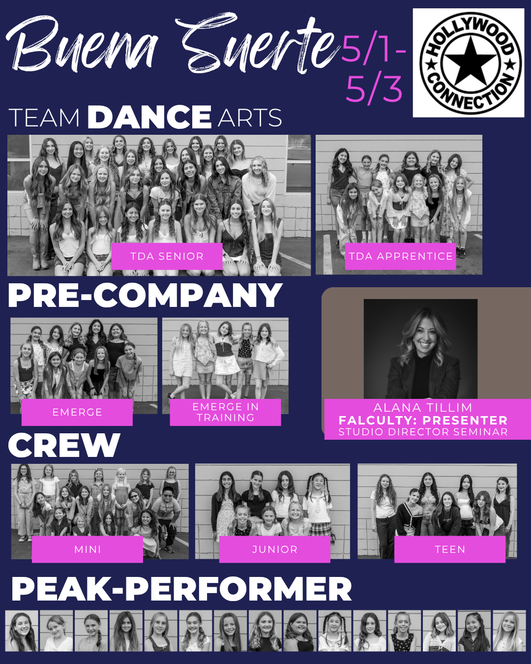BUENA SUERTE A TDA Senior, TDA Apprentice, Peak Performer, EMERGE, EIT y CREW: HOLLYWOOD CONNECTION
