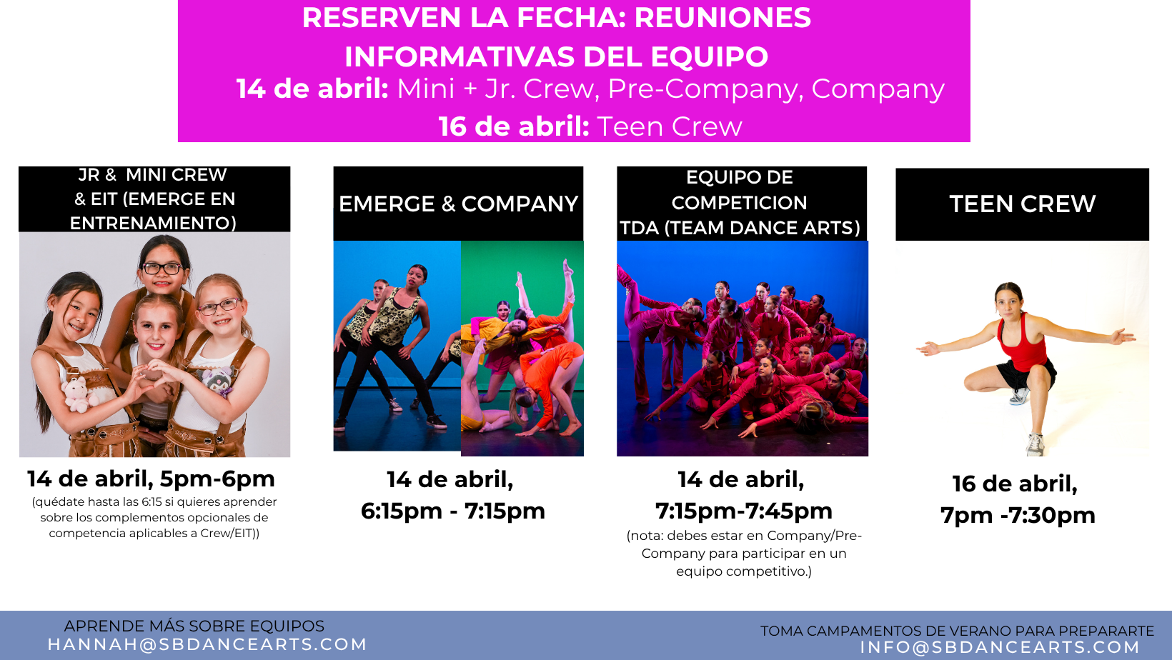 Los equipos son el corazón del estudio. ¿Quiere su bailarín(a) saber más sobre cómo formar parte de un equipo el próximo otoño? Vea este vídeo para obtener más información sobre los equipos de SB Dance Arts. ¡ÚNETE A LA FAMILIA!