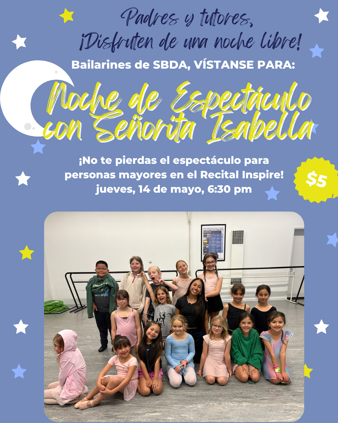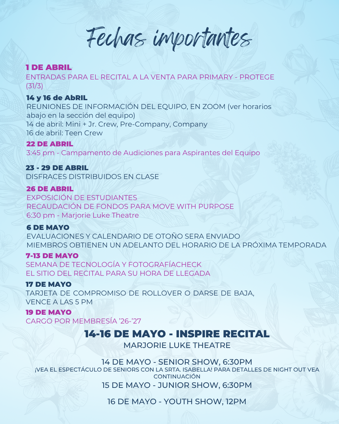 Para la venta de boletos, la planificación y los cambios en el horario de clases, es muy importante que sepas en qué show se presenta tu bailarín(a) lo antes posible.