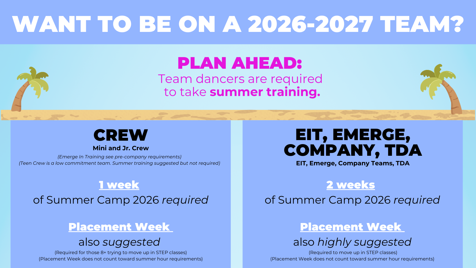 Summer camp registration opens February 11. See below for our summer schedule. More info to come soon!
