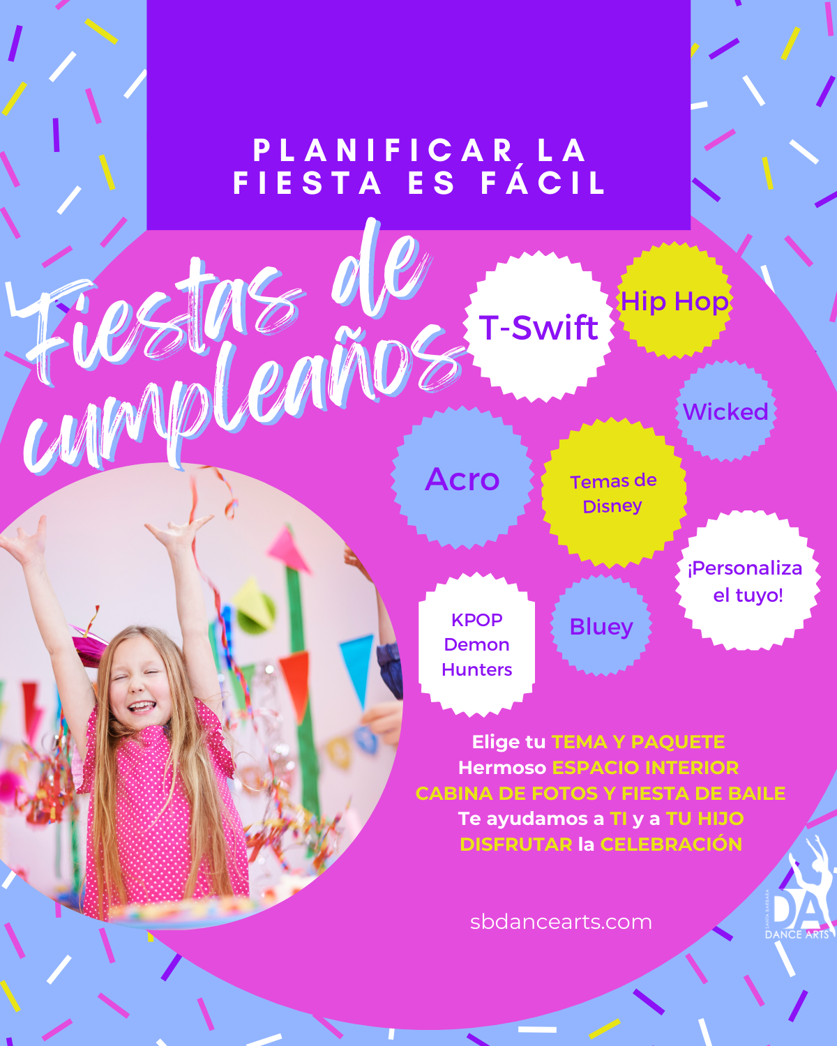 ¡Imagínese una clase de baile con los amigos de su hijo, su profesor de baile favorito, un pastel y regalos! ¡O haz tu propia fiesta en el estudio! ¡Eliminamos el estrés de la planificación de la fiesta y creamos una experiencia de fiesta inolvidable para el gran día de tu hijo!