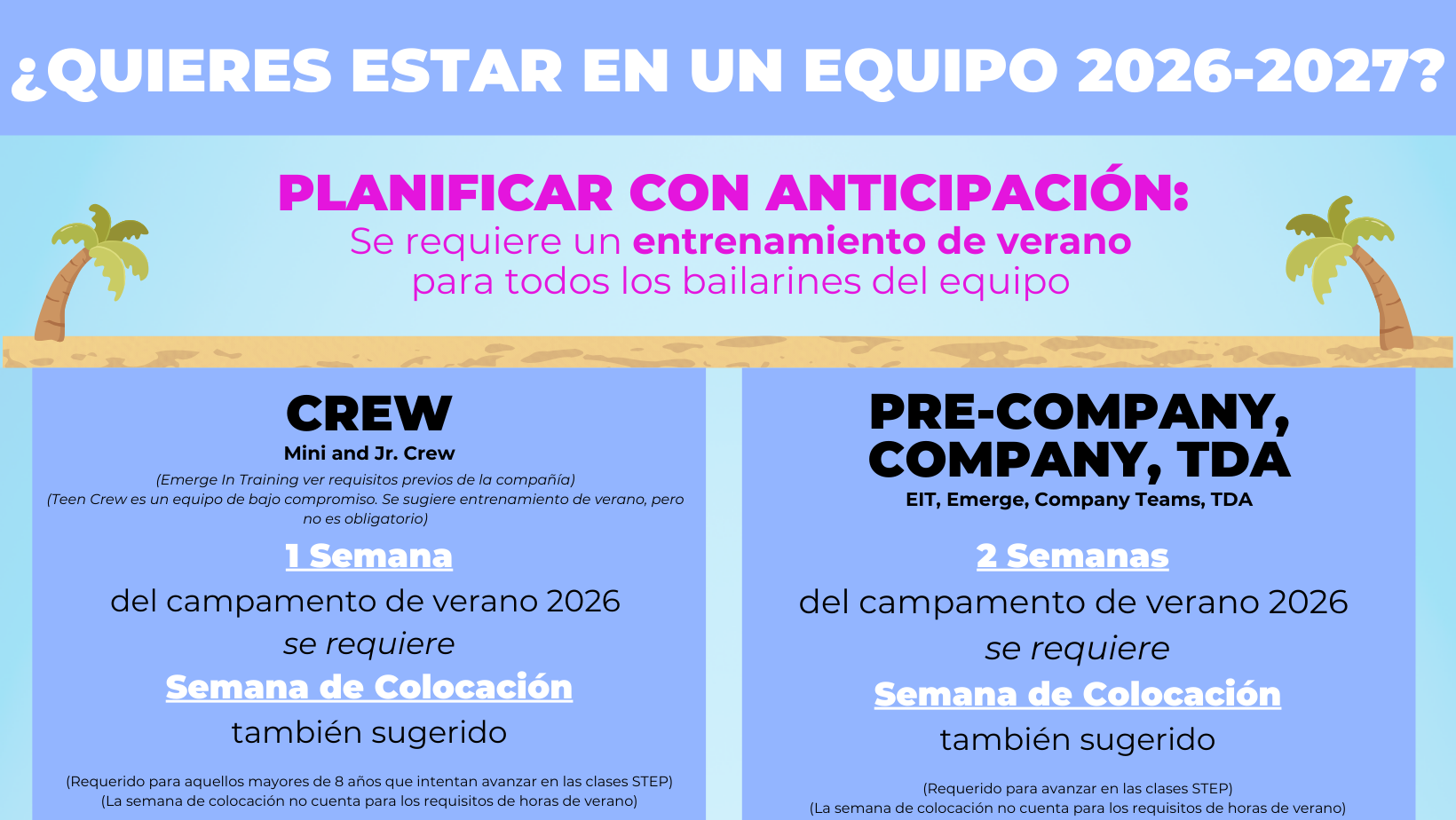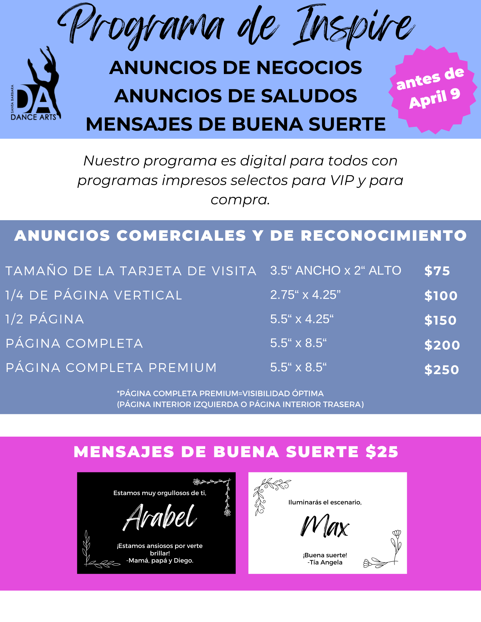 Para la venta de boletos, la planificación y los cambios en el horario de clases, es muy importante que sepas en qué show se presenta tu bailarín(a) lo antes posible.